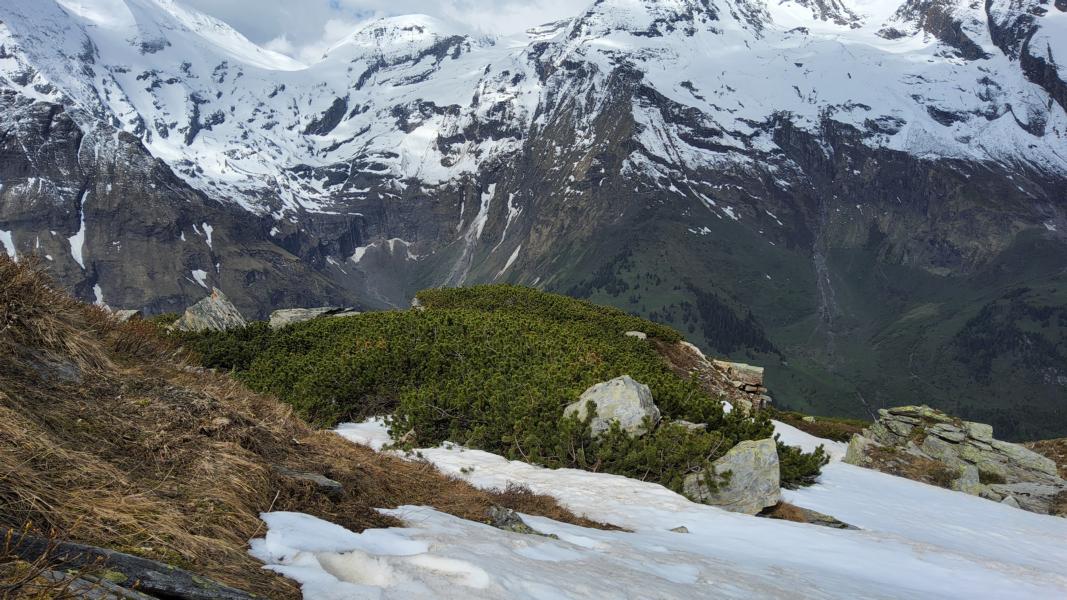 In den schneefreien Flächen in einer Höhe von ca. 1000m breiten sich Grasflächen aus, die u.a. mit Taglichtnelken und Schlüsselblumen geschmückt sind. Auch die Lärche ist noch präsent.